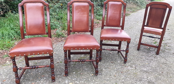 Cet ensemble de quatre chaises de salle à manger anciennes dégage une élégance intemporelle qui sublimera votre intérieur. Fabriquées en bois de haute qualité et revêtues d'un luxueux cuir marron, ces chaises créent une ambiance chaleureuse et accueillante. Leurs finitions soignées et leur design classique en font un complément idéal pour toute salle à manger.