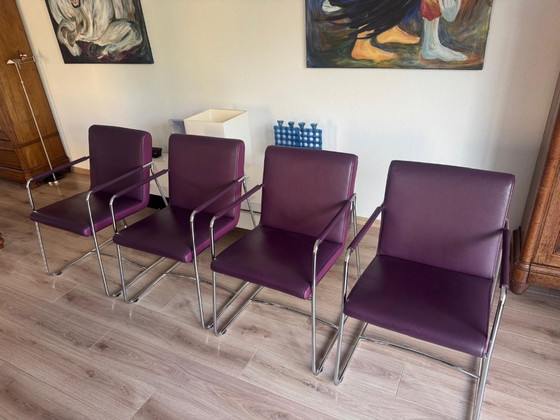 Apportez une touche de raffinement à votre salle à manger avec cet ensemble de quatre chaises Leolux Spring. Revêtues d'un cuir violet haut de gamme, ces chaises allient luxe et robustesse. Leur élégante structure en métal chromé leur confère une allure contemporaine, idéale pour un intérieur moderne. - Revêtement en cuir violet haut de gamme pour un style luxueux. - Structure en métal chromé pour une construction moderne et durable. - Design ergonomique avec accoudoirs pour un confort optimal. Ces chaises sont un excellent choix pour ceux qui recherchent style et confort. Contactez-nous pour plus d'informations ou pour organiser une visite.