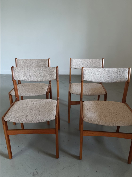 Ensemble de 4 chaises de salle à manger vintage danoises Erik Buch. Ces chaises en placage de teck sont revêtues d'un tissu brut beige-brun moucheté. En excellent état. Aucune tache, aucun trou, ni aucun autre dommage.