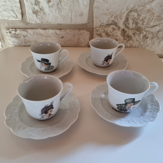 4 Tasses et 4 sous Tasses 'Lierre sauvage CNP France 4 décors différents de Femme au Chapeau. Le décor d 'une tasse correspond à sa 'sous tasse' Tasse: hauteur 6cm / sous Tasse: diamètre13.5cm Envoi soigné