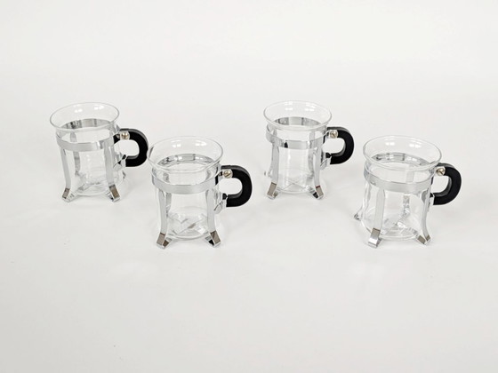 Ce design des années 1980 dégage une modernité décontractée, avec ses lignes épurées, ses supports chromés sculpturaux et ses anses noires incurvées qui confèrent une allure à la fois élégante et fonctionnelle au café, au thé ou aux cocktails.