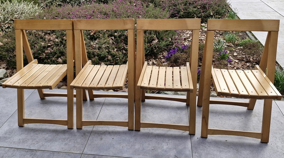 Ensemble de quatre chaises pliantes en bois, modèle « Trieste », dessinées par Aldo Jacober pour Alberto Bazzani.