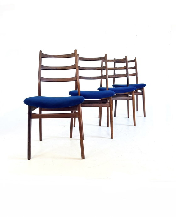 Ensemble de 4 chaises de salle à manger vintage de la marque allemande Casala, années 1960. Très belle structure en bois massif avec des bords arrondis et des veines de bois visibles. Les chaises ont un dossier décoratif en échelle légèrement incurvé vers l'arrière. Tous les cadres sont solides et en bon état. L'ensemble a été déshabillé et a un nouveau rembourrage en mousse froide. Les chaises ont été retapissées dans un tissu de haute qualité, Amara 'Saphyr', d'une magnifique couleur bleu royal. Le tissu a été traité au cours du processus de fabrication, ce qui le rend anti-salissures. En bref, l'ensemble est complètement frais et prêt à être installé dans un nouvel endroit. 1 chaise a été réparée par un professionnel, voir la dernière photo. Cela n'enlève rien à la solidité de l'ensemble. Dimensions Hauteur 90cm Largeur 47cm Profondeur 48cm Hauteur de l'assise 47cm