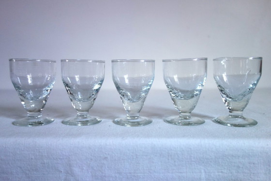 Lot de 5 petits verres à absinthe ( liqueur, alcool...). Verres soufflés à la main, vers 1900, avec de petits défauts de fabrication (bulle dans l'un, col irrégulier sur un autre). Fond très épais.