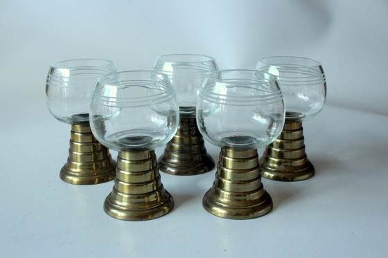 5 magnifiques verres anciens de l'époque Art déco. Les verres à vin sont gravés et possèdent un pied en métal couleur laiton. Très bon état vintage, pas de chips - voir photos. Verres à vin antiques classiques allemands art déco avec pied métallique en laiton coloré - fabriqués par Böhme + Hennen à Dresde /Allemagne dans les années 1920 - Collectibles.