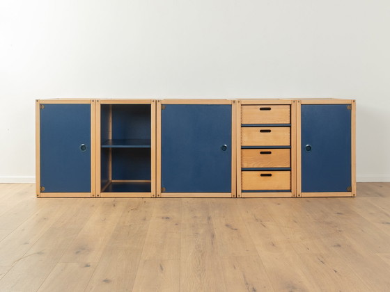Système de profilés en cinq parties de Flötotto datant des années 1970. Le système se compose d'un conteneur avec quatre tiroirs, d'un conteneur ouvert avec étagère et de trois conteneurs avec porte et étagère. Le cadre et les tiroirs sont en hêtre massif. Revêtement HPL d'origine en bleu. Fabriqué en Allemagne, fabricant : Flötotto.