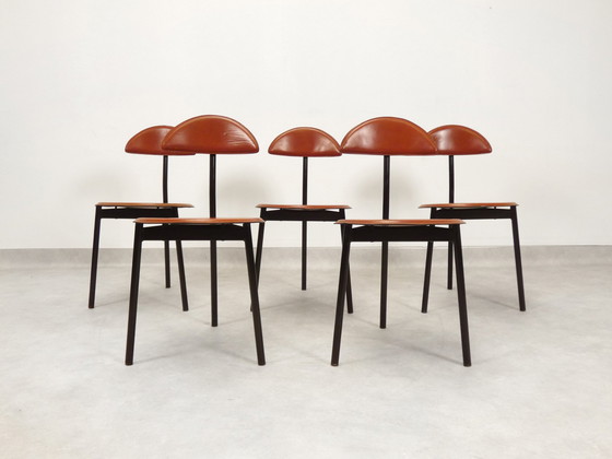 Les chaises ont une structure en métal noir avec une assise et un dossier en cuir rouge-brun épais.