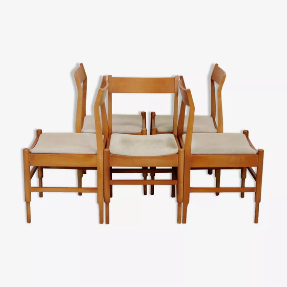 Dimensions: H82 x L44 x P50 Couleur: Bois (Couleur) Matériaux: Bois (Matériau) Style: Design Ensemble de 5 chaises en bois piètement fuselé, circa 1975. Assise en cuir synthétique (plutôt délicat, quelques traces et petites taches, voir photos). Bois léger à la géométrie poétique... Design élégant.