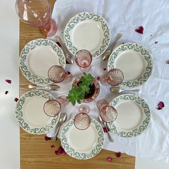 6 assiettes dessert terre de fer Longchamp modèle Trévise vert faïence ancienne