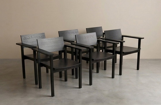 Six magnifiques chaises de salle à manger Studio Henk en chêne teinté noir. Elles sont comme neuves ! Quelques petits défauts (voir photos). L'une des chaises présente une fissure dans le bois du dossier, qui est fourni gratuitement ! J'en demande 200 € par chaise. Leur prix d'origine est de 540 € pièce, soit un total de 3 200 € neuves !