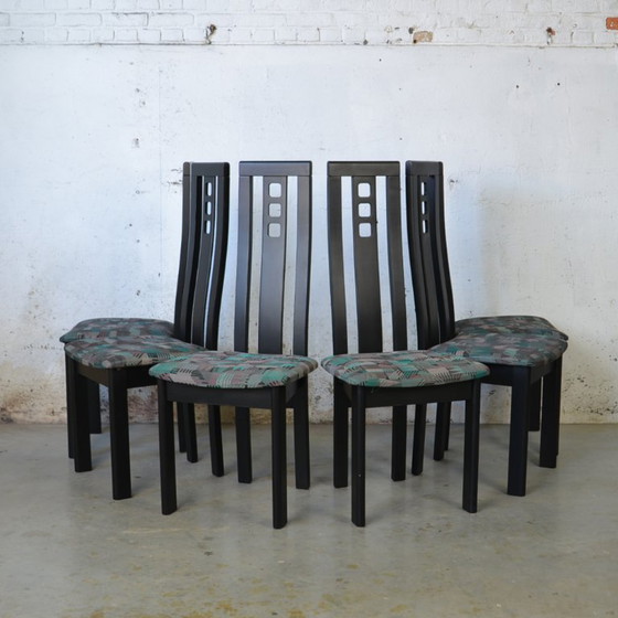 Cet ensemble de six chaises de salle à manger des années 80 associe une élégante structure en bois noir à des assises en tissu coloré. Leur style rétro s'intègre parfaitement dans un intérieur vintage ou éclectique. Robustes et confortables, elles sont idéales pour de longs dîners et des soirées conviviales. Apportez une touche de nostalgie à votre salle à manger avec cet ensemble unique.