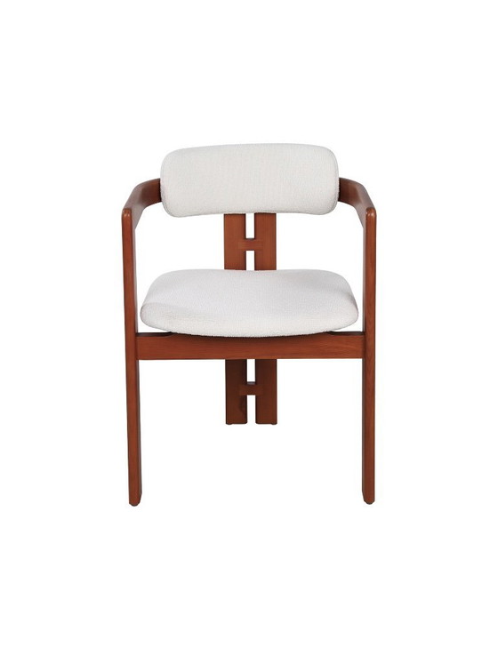 6 chaises de salle à manger en frêne, coloris cognac, avec revêtement en tissu bouclé blanc.