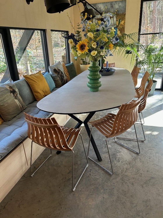 L'alliance du chêne cintré et du piètement minimaliste en acier inoxydable confère à ces chaises un style intemporel et raffiné, s'intégrant aussi bien dans un intérieur moderne que chaleureux.