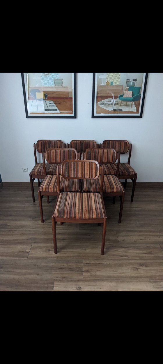 Découvrez cet ensemble de six chaises vintage au design scandinave par Johannes Andersen parfait pour ajouter une touche d'élégance rétro à votre salle à manger. Fabriquées en bois de haute qualité, ces chaises se distinguent par leur structure robuste et leur finition soignée.