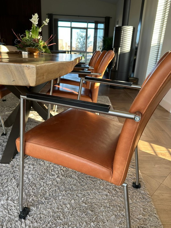 - Fabriqués en cuir de haute qualité et en chrome. Les fauteuils sont montés sur roulettes.
