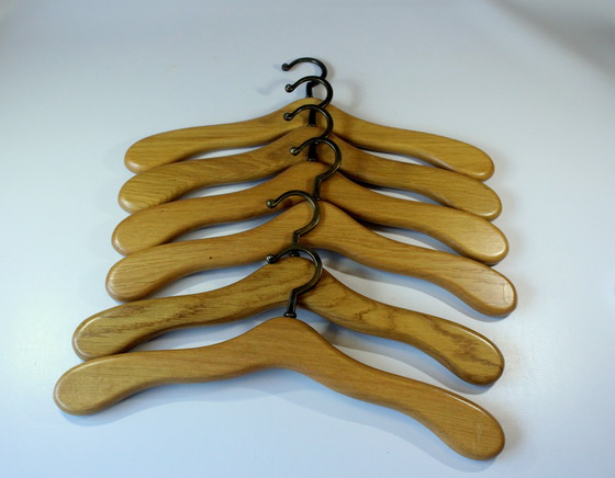 Elégants cintres stables (6 pièces), cintres en bois solide (environ 2 cm d'épaisseur) avec suspension métallique - très bon état vintage avec traces minimales de vieillissement et d'utilisation - coat hanger, coat holder, vintage, mid Century - set of 6