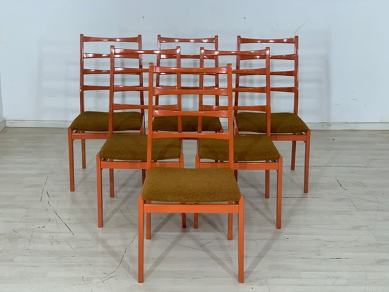 Six belles chaises de salle à manger sont disponibles à la vente. Le bois a été peint en orange / marron.