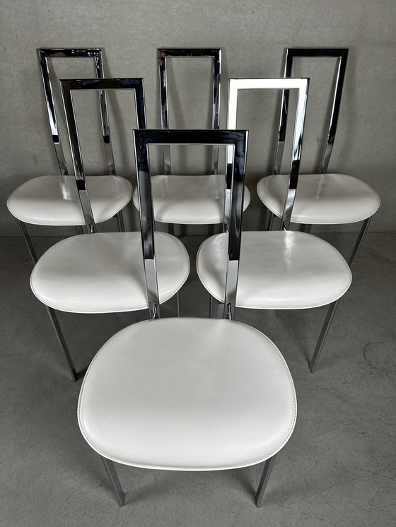 Ensemble de 6 chaises de salle à manger de très belle qualité. Cattelan Italia. Marqué. Assise en cuir avec très peu de signes d'utilisation. Le chrome est en très bon état. Design élancé. Hauteur dossier compris : 91cm. Largeur : 48cm. Profondeur : 53cm. Hauteur de l'assise : 47cm.