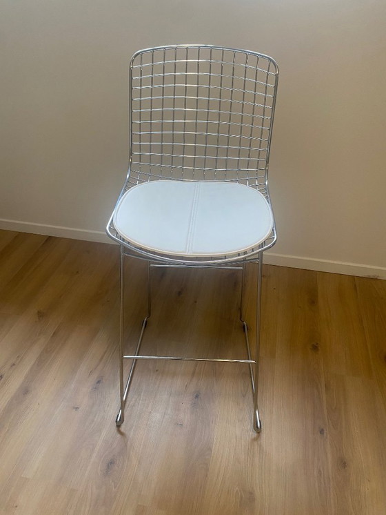 Découvrez l'élégance intemporelle des tabourets de bar Bertoia, icône du design Mid-Century Modern. Avec leur structure en métal argenté et leur assise en cuir blanc, ces tabourets apportent une touche de sophistication à tous les espaces.