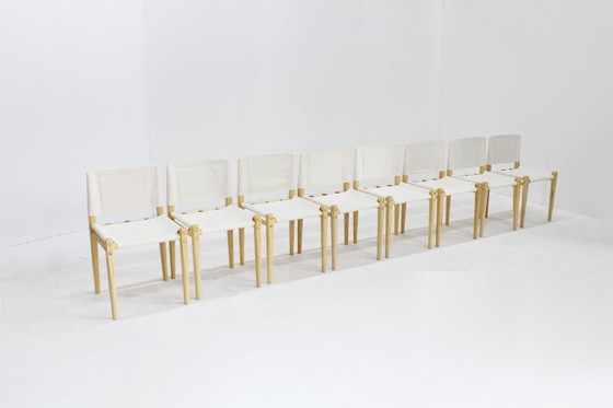 Ensemble de huit chaises de salle à manger vintage, modèle Linda, conçues par De Pas, Durbino et Lomazzi pour Zanotta en Italie. Fabriquées en bois, toile et sangles de cuir. Signées Zanotta.