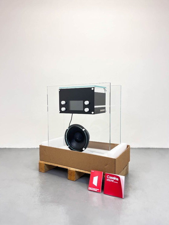 La radio à cristal est un modèle de 1940 conçu par Franco Albini et réédité par Cassina dans la collection I Maestri. Sa structure est en verre trempé extra-clair, avec un coffret en MDF laqué noir mat. Les câbles d'alimentation et de haut-parleurs sont gainés de tissu noir. Toutes les pièces métalliques sont apparentes. L'objet est assez lourd.