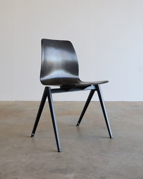 Ensemble de six chaises vintage Galvanitas S22 des années 1960, également appelées « chaises de passage ». Ces chaises possèdent un élégant piètement en métal et une assise en contreplaqué Pagholz. Les assises sont en excellent état et présentent un magnifique veinage. Elles sont presque noires (voir photos détaillées).