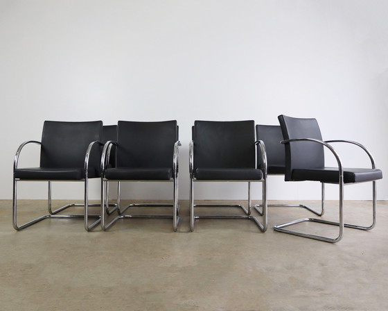 8 magnifiques chaises conçues par le professeur Wolgang C.R.Mezger. Les chaises sont en cuir véritable et ont une structure tubulaire chromée. Quelques légères marques d'usage sur les accoudoirs dues à l'utilisation.