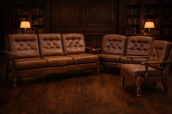 A vintage brown three-piece sofa set in leather with wooden armrests and turned legs, comprising a 1-seater, 2-seater and 3-seat