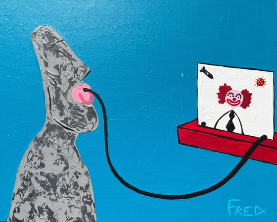 Peinture dénonçant l’abrutissement de la population qui ingurgite sans esprit critique le narratif médiatique.