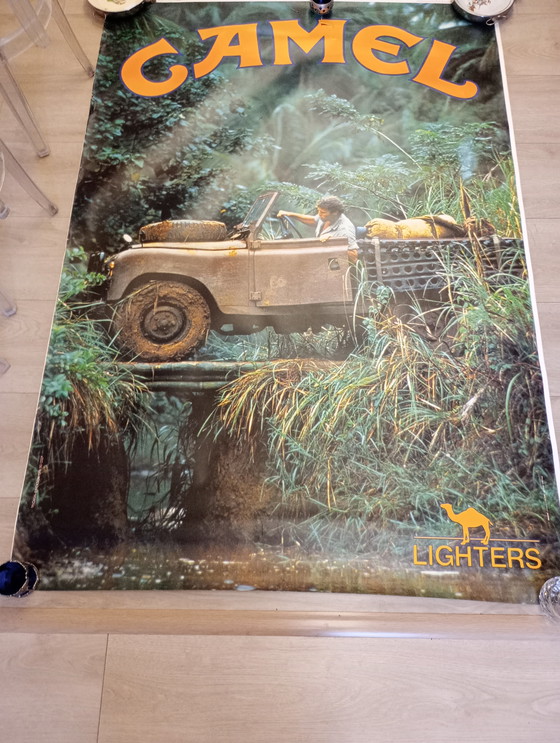 Il s'agit d'une affiche vintage de briquets Camel représentant une scène de plein air avec un véhicule classique. L'affiche présente des couleurs vibrantes avec un fond de jungle vert dominant et un lettrage orange audacieux. Elle est imprimée sur papier et constitue un excellent objet de collection pour les amateurs de publicité vintage ou de souvenirs de Camel.