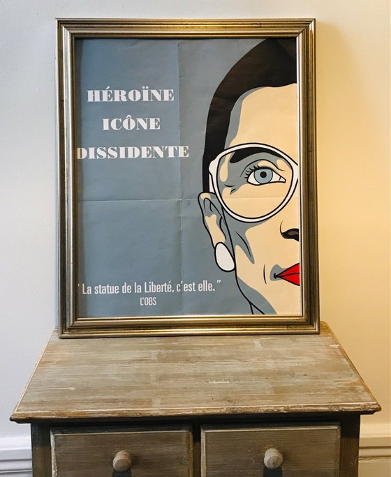 Extrait affiche de film encadrée. "RBG" pour Ruth Bader Ginsburg (1933-2020), film documentaire de 2018. Juge de la Cour Suprême aux États Unis et icône de la pop culture. Représente la moitié de son visage mettant en avant sa bouche rouge, ses lunettes et ses boucles. Couleurs reprises des oeuvres d'un célèbre artiste contemporain. "La statue de la liberté c'est elle." L'OBS "Héroïne Icône dissidente". Cadre ancien bois mordoré sans vitre. Traces de pliage. 55,5 x 67,5 cm profondeur 4 cm