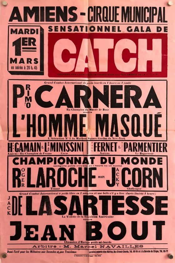 Dominée par un fond rose vif, cette composition repose sur une hiérarchie typographique percutante pour transmettre l'information. Des caractères noirs sans empattement, disposés horizontalement, détaillent l'événement du « Cirque Municipal ». Un rectangle rouge proéminent centre la composition, encadrant le mot « CATCH » en blanc. Le langage visuel est purement fonctionnel, privilégiant la lisibilité et l'impact par l'échelle et le contraste, avec notamment la liste des combats : « Primo Carnera » contre « L'Homme Masqué ».
