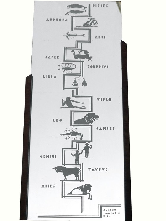 Albano & Macario Torino production dans les années '20/'30 art decò miroir mural zodiaque technique raffinée des années '20, je joins aussi l'info de la terrasse Solferino Turin par Albano & Macario dans les années '900 avec leur vitrail artistique .
