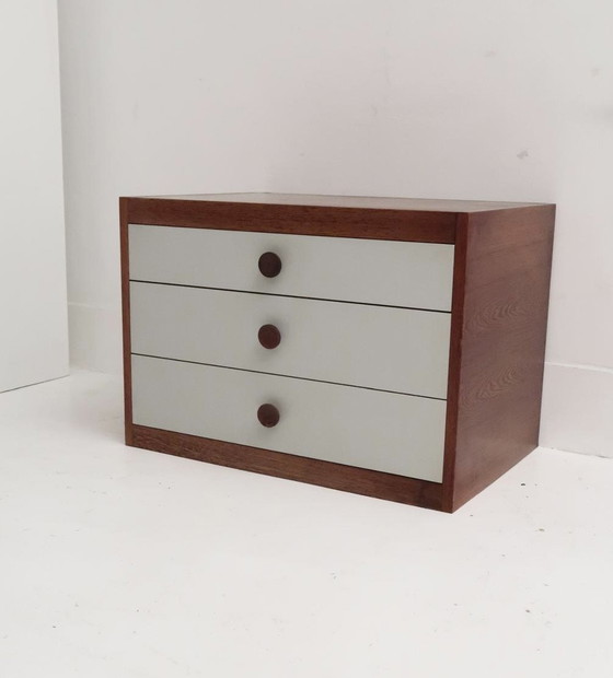 Avec sa structure élégante en wengé et ses façades de tiroirs blanches contrastantes, elle allie style et fonctionnalité.