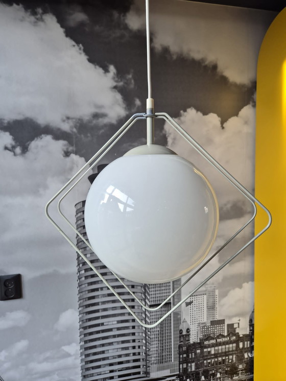 Lampe suspendue bulb 💡 Cette lampe suspendue élégante au look moderne et minimaliste mesure 43 cm de large, 43 cm de haut et 22 cm de profondeur. La lampe se compose d'une sphère en verre blanc qui fournit une lumière douce et diffuse, idéale pour l'éclairage d'ambiance de n'importe quelle pièce. L'ampoule est encadrée par un cadre métallique géométrique de couleur claire et subtile, ce qui lui confère un aspect contemporain et ludique. Quelques signes d'utilisation, mais fonctionne à merveille !