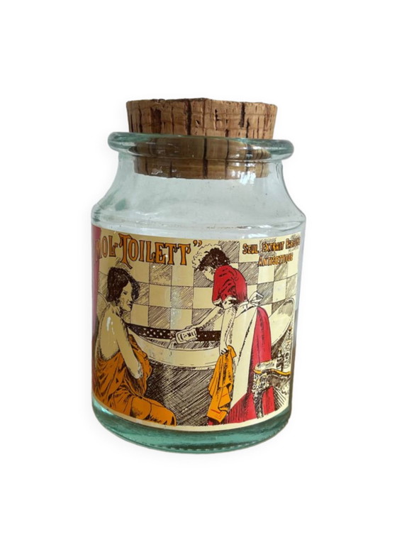 Ancien bocal à sels de bain en verre et bouchon en liège Thymol Toilett Idéal pour une touche vintage brocante dans une salle de bain pour ranger les corons par exemple Hauteur 16cm Diamètre 11cm