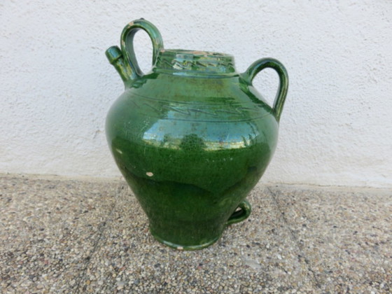 Ancienne jarre à huile en terre cuite vernissée vert, sud de la France, fin XIXème