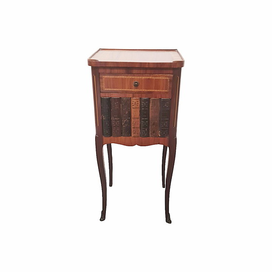 Ancienne table de chevet de style Louis XVI, datant d'environ 1900. Magnifique table de chevet de style Louis XVI avec miroir caché et compartiment. Elle est plaquée sur tout son pourtour d'acajou et de divers autres bois. Elle comporte un tiroir et une porte sur laquelle reposent des dos de livres. Les pieds cabriole élancés sont ornés de décorations en bronze à l'avant. Pour son âge, il est en très bon état.