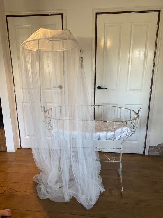 Remontez le temps avec ce charmant berceau ancien en métal, idéal pour apporter une touche d'élégance vintage à votre intérieur. Son travail du métal délicat crée une atmosphère onirique.