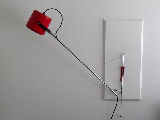 Très rare applique à balancier d'Anvia Almelo des années 1960. La "tige" de cette lampe particulière peut être levée et abaissée par une chaîne qui disparaît dans le cadre sur lequel une boule de métal est suspendue comme un contrepoids. Cette lampe vintage fonctionne correctement et est dans son état d'origine, la lampe a des signes d'utilisation, des taches près du bord de l'abat-jour comme le montrent les photos. La tige avec l'abat-jour mesure 95 cm de long, l'abat-jour mesure 15 cm de long et 15 cm de diamètre. La tige murale mesure 35 cm de long. Grand modèle E27 .