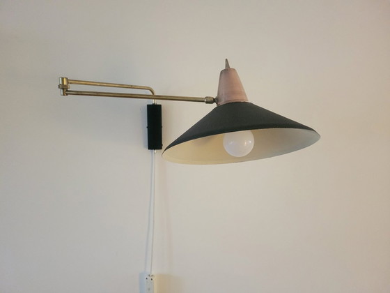 Magnifique applique murale de Van Doorn Culemborg des années 1950. Son bras pivotant couleur laiton est orientable à gauche et à droite. L'abat-jour, grâce à sa charnière, est orientable dans différentes positions. La lampe est en bon état vintage, avec de légères traces d'usure normales pour son âge.