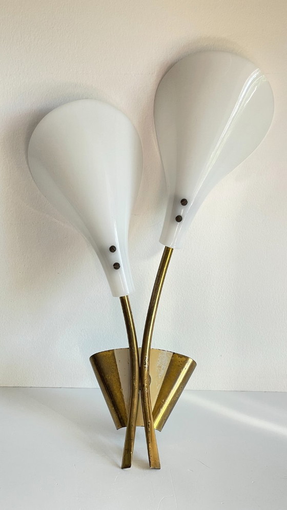 Très belle Applique Murale et Sculpturale des Années 60, une Merveille en matière Synthétique Blanche et translucide pour ses Réflecteurs et métal doré patiné pour la structure.
