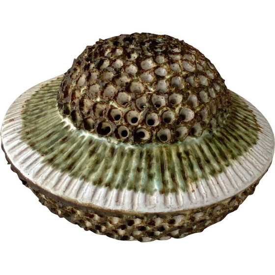 Superbe lampe murale en céramique de style Tournesol avec des couleurs émaillées dans les tons de terre comme le beige, le vert et le marron. La lampe présente de multiples perforations où la lumière brille magnifiquement. La pièce n'est pas clairement signée, mais elle est tout à fait dans le style de Jette Helleroe pour Axella. La pièce est en bon état, avec une usure mineure due à l'âge et à l'utilisation.