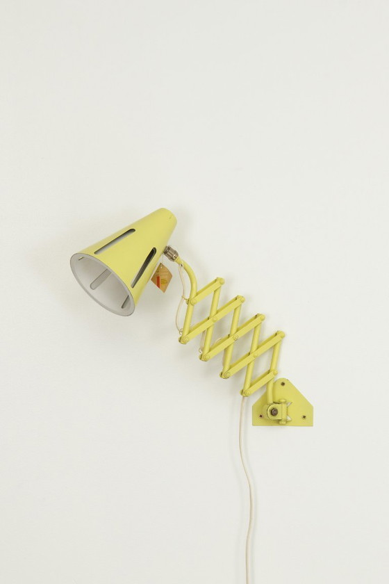 Applique murale à bras articulé HALA de Zeist, datant des années 1950. Elle est dotée d'un abat-jour en métal jaune et d'un bras articulé réglable, permettant d'orienter la lumière vers l'extérieur ou au plus près du mur.