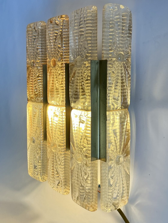 Fabriquée en verre épais texturé par le fabricant suédois Orrefors, elle est dotée d'une structure en laiton.