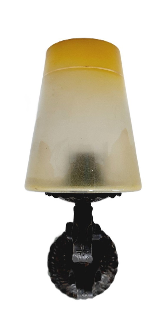 Illuminez votre espace avec cette magnifique applique murale électrique vintage en fer forgé, témoignage d'une élégance et d'un savoir-faire intemporels. Son travail de ferronnerie complexe, associé à un abat-jour en verre aux teintes douces, crée un mariage harmonieux entre forme et fonctionnalité, idéal pour ajouter une touche de sophistication à n'importe quelle pièce.