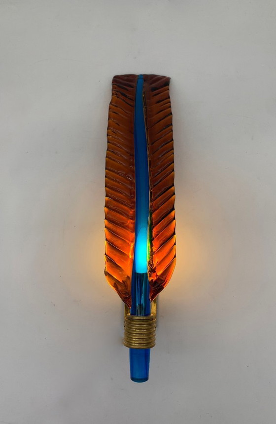 Cette lampe présente une forme allongée et verticale évoquant une feuille stylisée. Façonnée en verre aux surfaces ondulées et gravées dans des tons chauds d'orange et d'ambre, elle entoure un élément central en verre bleu profond. Une lumière froide la traverse, créant un contraste chromatique saisissant avec le corps extérieur.