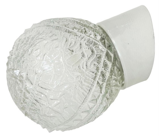 Applique murale industrielle vintage fabriquée en Pologne dans les années 1970. Elle est composée d'une fixation murale en porcelaine blanche et d'un abat-jour en verre. La douille est compatible avec les ampoules E27/E26. Câble neuf. Poids : 1 kg.