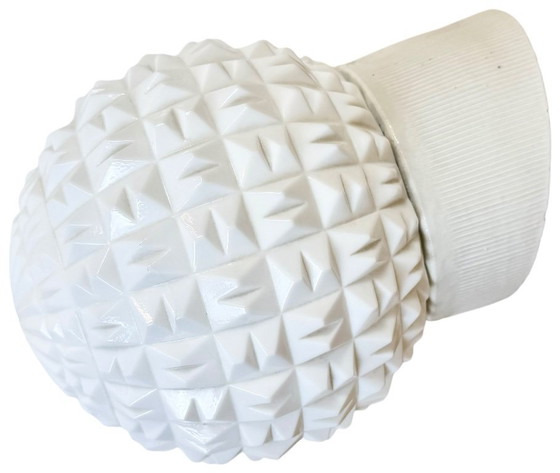 Lampe industrielle vintage fabriquée en ex-Tchécoslovaquie dans les années 1970. Elle est composée d'une fixation murale en porcelaine blanche et d'un abat-jour en verre opalin. La douille est compatible avec les ampoules standard E27/E26. Câble neuf. Poids : 1 kg.