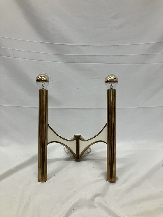 Une magnifique applique murale italienne en laiton, modèle 105, conçue par Gaetano Sciolari pour Sciolari Roma dans les années 1960. Cette applique, issue d'une des premières éditions, a été créée par Gaetano Sciolari à Rome, en Italie, dans les années 1960. Elle présente d'élégantes structures en laiton et des bras ornés d'incrustations métalliques couleur crème. L'applique a été testée et fonctionne comme illustré. Elle peut également être équipée d'un interrupteur à tirette ou fixée directement au mur.